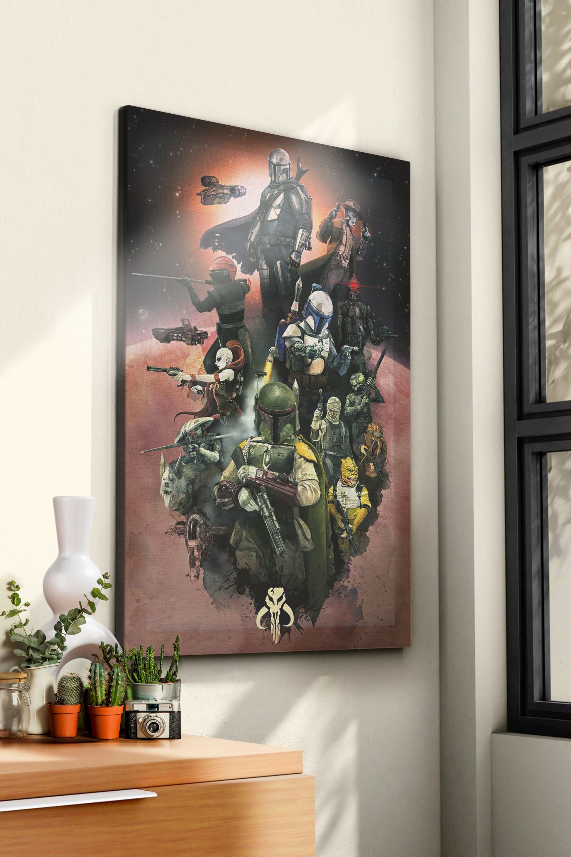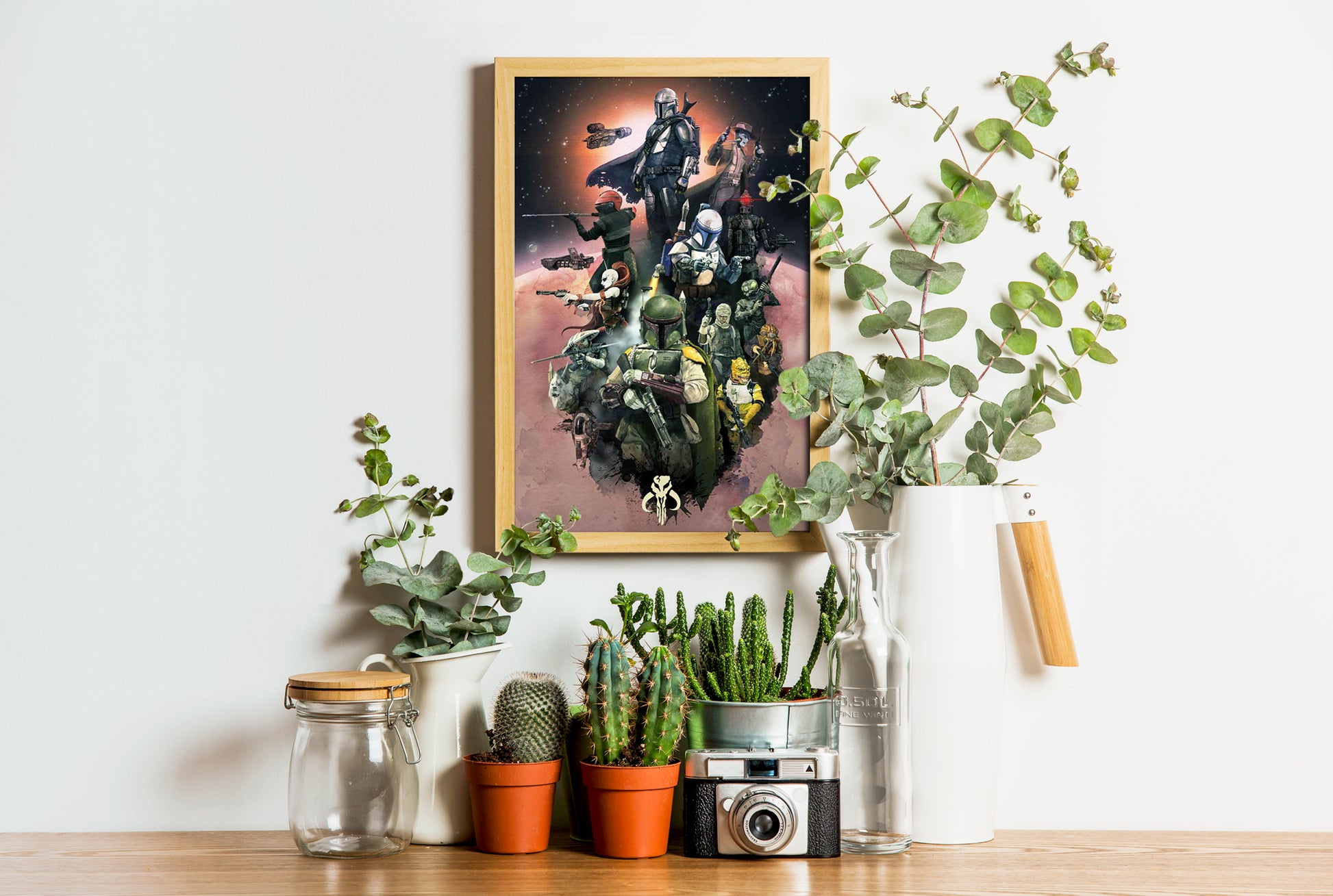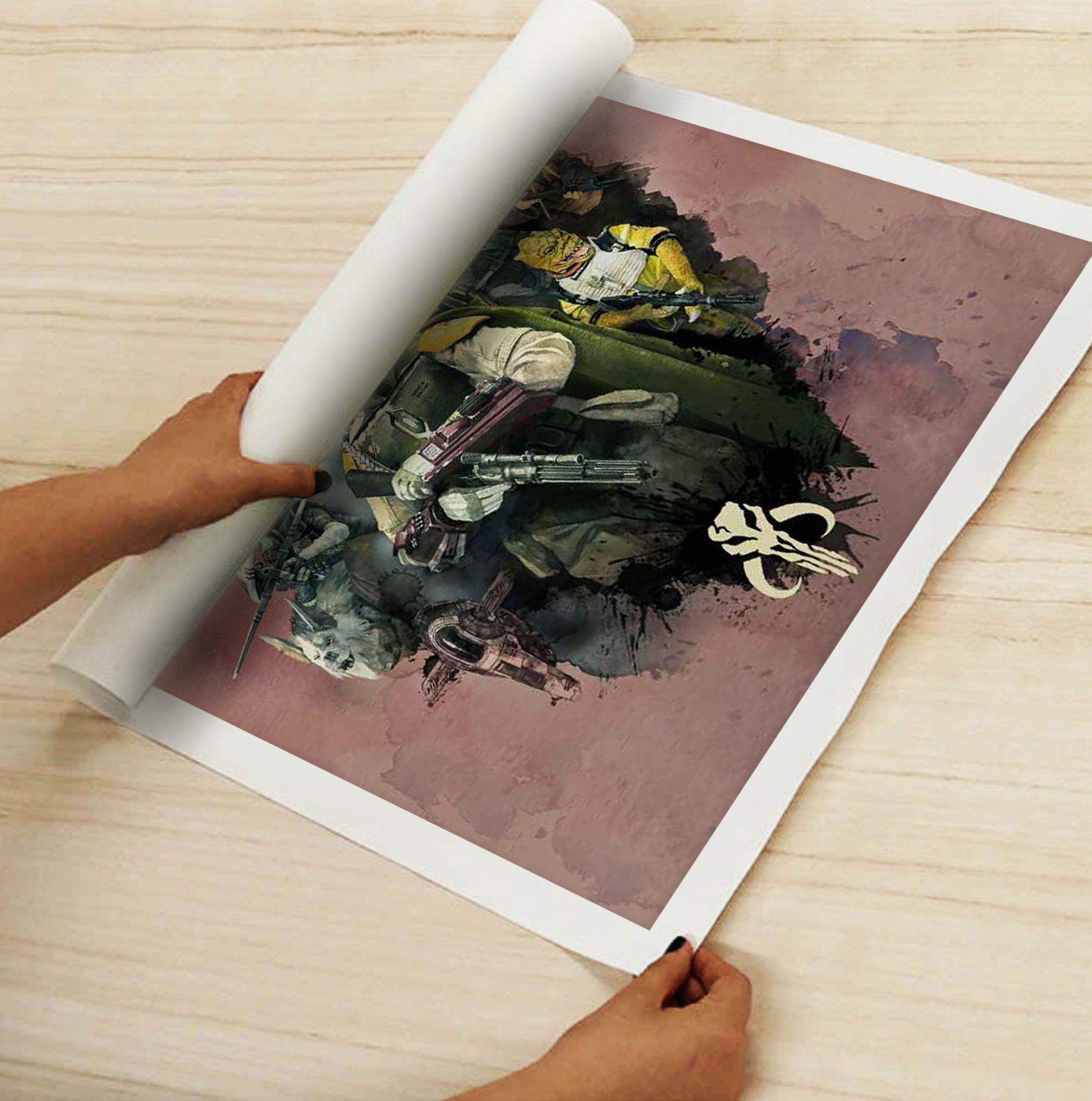 Own a print of this fine art painting of the best bounty hunters in the Galaxy! This print will look beautiful hanging above your Star Wars collectables or framed in your office, dorm, kid's room, or wherever you like! It also makes an awesome and personalized gift for the fan in your life.