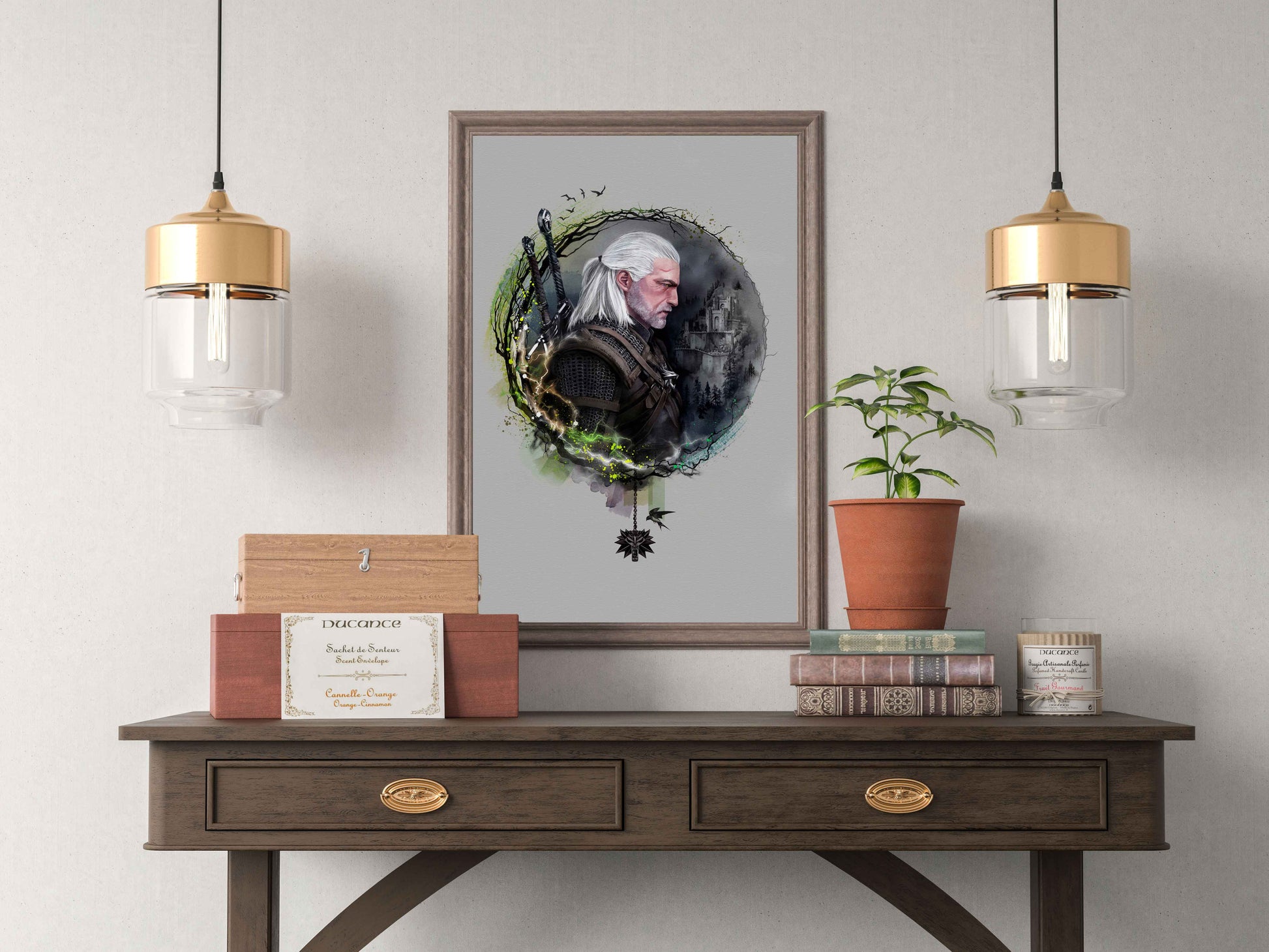 A classy fan-art illustration of the fierce yet stoic Geralt of Rivia, the main character from the popular video game series The Witcher. This print will look beautiful in your office, dorm, game room, or wherever! It also makes an awesome and personalized gift for the Witcher fan or gamer in your life.